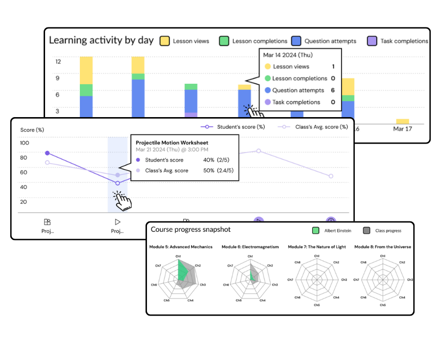 Understand learning behaviour patterns at a glance with beautifully designed reports curated with powerful engagement, progress, and performance metrics.