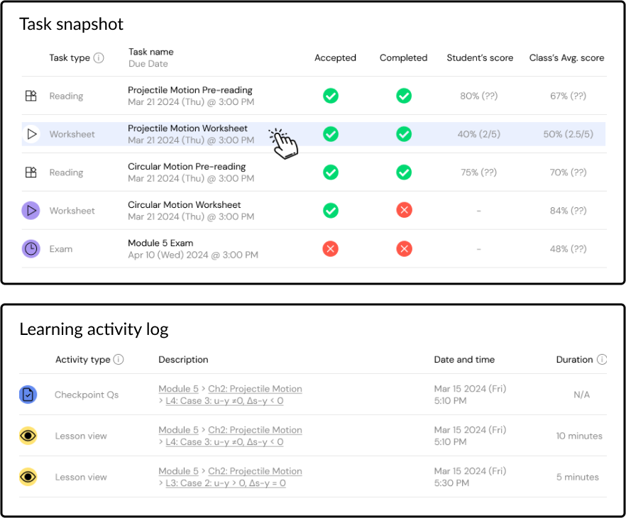Save time chasing up students for homework and assignments. Monitor real-time task attempts and completion with progress data.